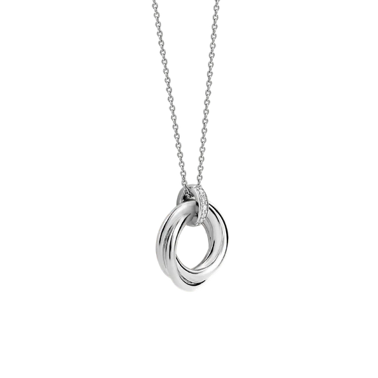 Su collar de plata luce un colgante circular con elegantes líneas retorcidas y un pavé de circonitas blancas en el centro. Este collar, elaborado en plata de ley 925, es una pieza de lujo que evoca un estilo único.